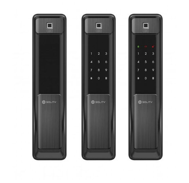 Корпус замка выполнен из алюминия и abs- пластика черного цвета. Врезная часть имеет два ригеля.Замок оснащен встроенным биометрическим сканером отпечатка пальца. Открывается паролем - 4 шт, запоминает до 100 RF-карт и отпечатков пальцев, есть 2 аварийных механических ключа.Есть мобильное приложение Solity.Рекомендуемая толщина двери 40-120 мм.